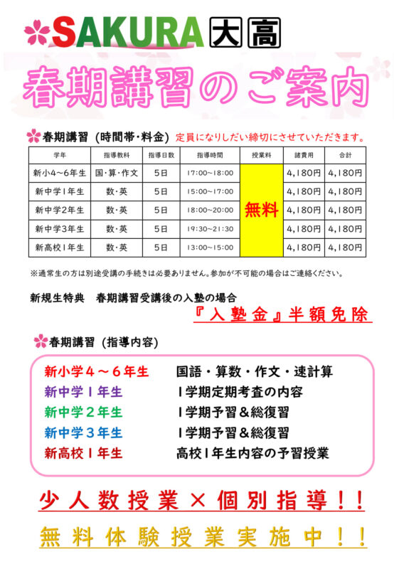 | 2026年2月7日 | 春期講習のご案内をアップしました! |